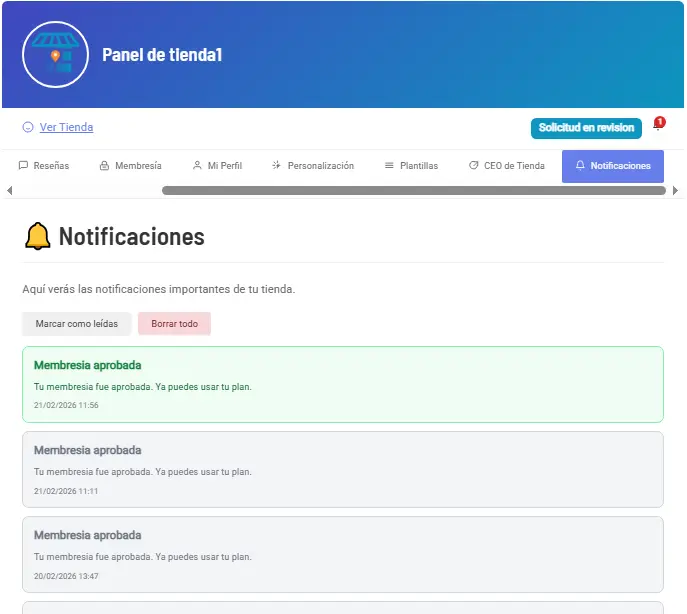 Recibe avisos de acciones, mensajes del administrador y solicita la verificación de tu tienda.