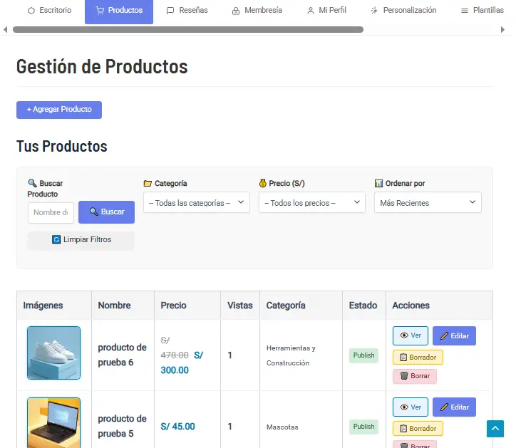 Crea, edita o elimina productos fácilmente desde tu panel.