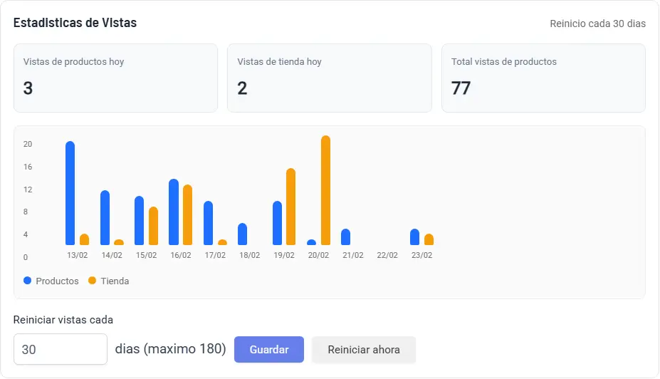 Visualiza vistas diarias, mensuales, vistas de tu tienda y estadísticas gráficas. Controla el reinicio de métricas cuando tú decidas.